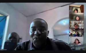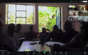 図書館委員の方々10名ほどと日本の会員とがそれぞれ自己紹介をスワヒリ語や英語でしあった後、 議長とライブラリアンのピーターさんから少し長めのメッセージをいただきました。図書館を利用する子どもは増えており、子どもたちはおかげで学校での成績も伸びているし、おとなも利用しコミュニティにとって大事な場所になっているとおっしゃっていました。今日はエンザロの電波が悪く、途中何度かインターネットの接続が途切れてしまいましたが、元気そうな現地のみなさんの顔をみて話ができてよかったです。稲角会員からは、エンザロとシャンダのドリームライブラリーの活動についての進捗報告もありました。